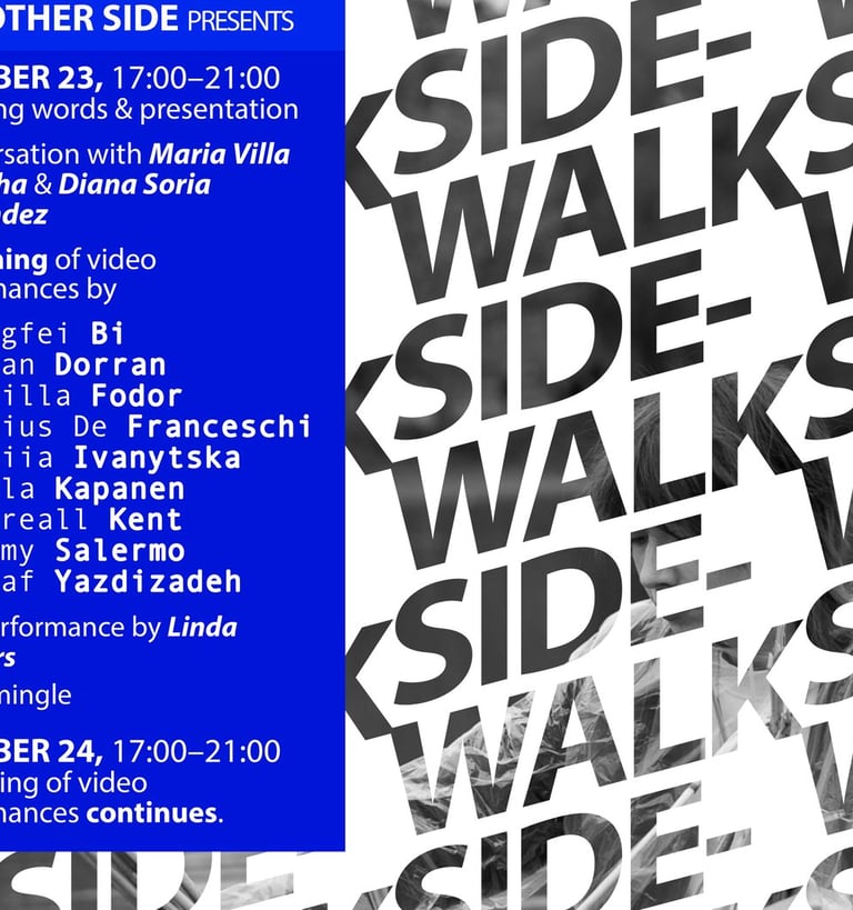 The Other Side team carried out the second phase of Sidewalk 2nd Ed. during July 2025: the production phase. In this phase, we documented the performances of the nine participants, which will be exhibited at Publics on November 25. The featured artists include Kamilla Fodor, Sadaf Yazdizade, Nikan Dorran, Hongfei Bi, Paula Kapanen, Jimmy Salermo, Yuliia Ivanytska, Coireall Kent, Nilius De Franceschi. The exhibit opens on October 29th!
